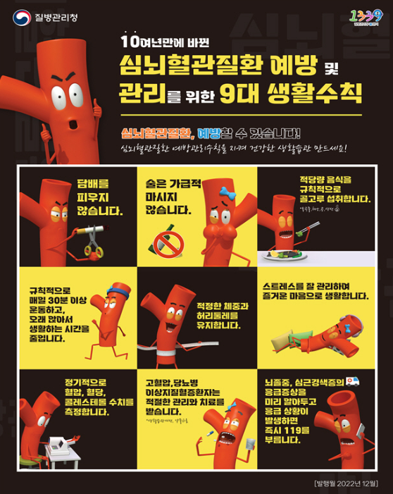 이상과 같이 이번에 개정된 뇌졸중·심근경색(심뇌혈관질환) 예방 및 관리를 위한 9가지 수칙을 알아보았습니다. 모쪼록 적극적으로 생활습관을 잘 관리해 건강한 삶을 누리시기를 바랍니다.
