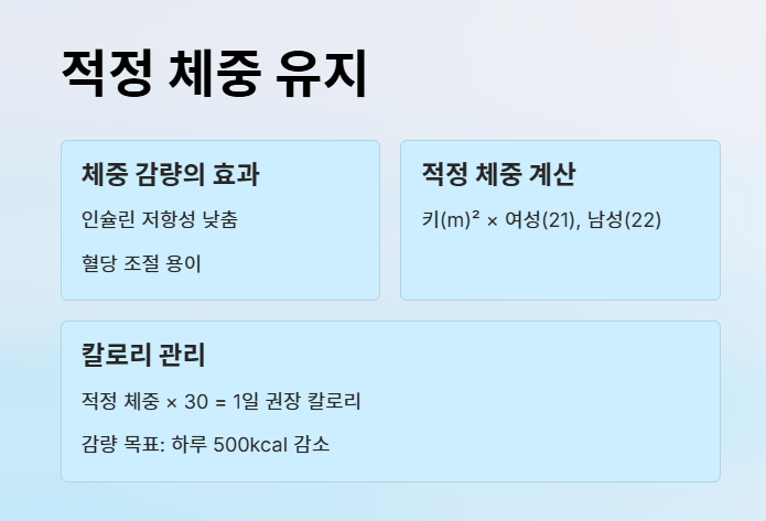비만은 당뇨병의 주요 원인 중 하나입니다. 체중 감량만으로도 인슐린 저항성을 낮출 수 있으며, 혈당 조절이 쉬워집니다.
