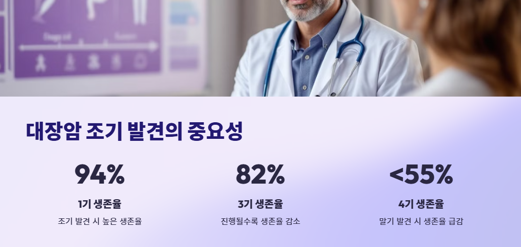 대장암은 초기에는 별다른 증상이 없는 경우가 많아 조기 발견이 어렵습니다. 하지만 1기에서 발견할 경우 생존율이 94%에 달할 정도로 치료 효과가 높습니다. 반면, **3기(82%), 4기(55% 이하)**로 진행될수록 생존율이 급격히 낮아집니다.