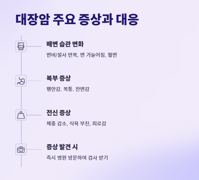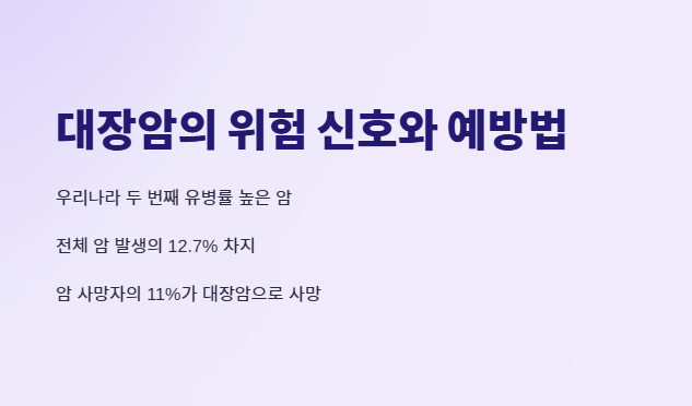 - 50세 이상 성인: 국가에서 무료로 제공하는 **대장암 검진(분변잠혈검사)**을 1년에 한 번씩 받는 것이 중요합니다.