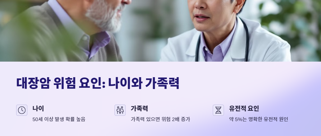 대장암은 50세 이상의 연령층에서 발생 확률이 높습니다. 또한 유전적인 요인도 영향을 미치는데, 대장암의 약 5%는 명확한 유전적 원인으로 발생하며, 5~15%는 가족력과 관련이 있다고 알려져 있습니다.