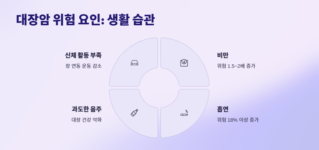 흡연과 과도한 음주는 거의 모든 암의 위험을 증가시키는 것으로 알려져 있습니다. 특히 흡연은 대장암 발생 위험을 18% 이상 증가시키며, 과도한 음주 역시 대장 건강을 악화시킬 수 있습니다. 따라서 대장암을 예방하려면 금연과 절주가 필수적입니다.
