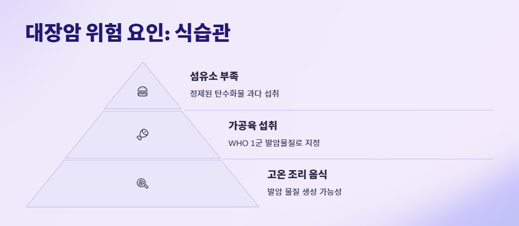 대장암 발생과 식습관은 밀접한 관계가 있습니다. 특히 고지방 식단, 가공육 섭취, 섬유소 부족 등이 대장암 위험을 증가시킬 수 있습니다.