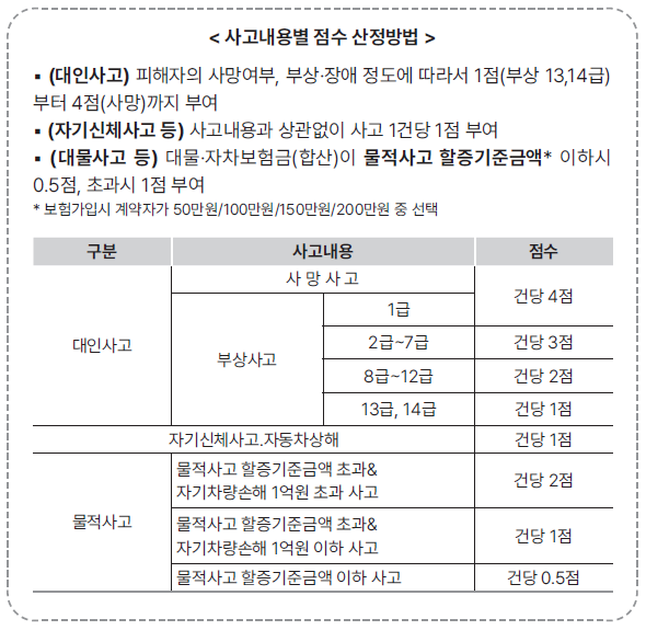 사고의 내용(보험금 규모)에 따라 보험료가 할인 또는 할증됩니다. 직전 1년간 발생한 사고내용별 크기에 따라 점수를 부여하고, 동 점수로 할인·할증 등급(최초 기본등급 11등급, 총 29등급 체계)을 평가하는데, 1점당 1등급을 할증하며, 1등급당 보험료가 평균 약 7% 할증됩니다.