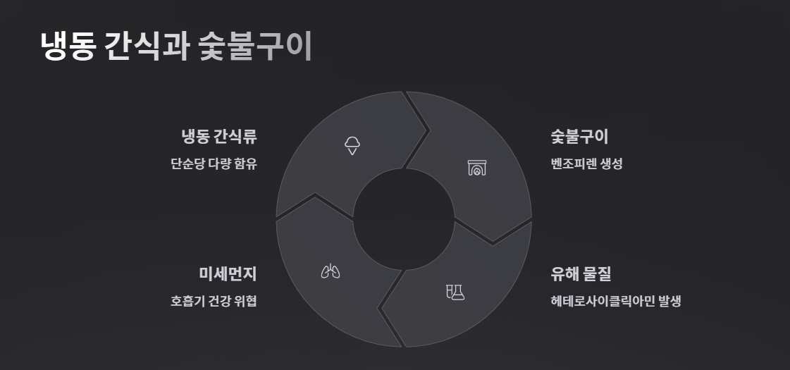 숯불에 구운 고기는 벤조피렌과 헤테로사이클릭아민(HCA)과 같은 발암물질이 생성됩니다. 또한, 숯불에서 발생하는 유해 화학물질과 미세먼지도 건강에 해로울 수 있습니다. 따라서 숯불구이는 가능한 한 피하는 것이 좋습니다.