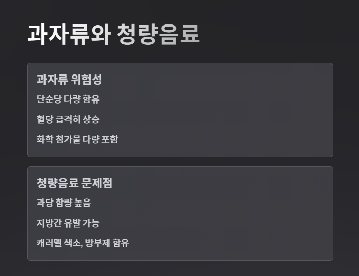 청량음료에는 과당이 많이 포함되어 있으며, 이는 지방간을 유발할 수 있습니다. 또한, 캐러멜 색소, 인산, 방부제 등이 첨가되어 있어 발암물질로 작용할 수 있습니다. 따라서 청량음료의 섭취를 줄이는 것이 좋습니다.