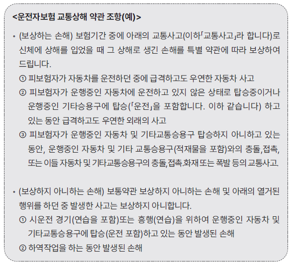 운전자보험이란 교통사고가 발생했을 때 자동차보험에서 보장해주는 내용 이외에 추가로 발생할 수 있는 각종 손해에 대해 보장해주는 보험을 말합니다. 자동차보험은 자동차손해배상보장법에 의해 가입이 의무화되어 있고 보험감독업무 시행세칙에 의해 표준약관이 정해져 있어 보험회사별로 상품의 내용이 대체로 동일합니다. 이에 반해 운전자보험은 법령의 규정이나 정해진 표준약관이 없어 보험회사별로 상품의 내용이 많이 다를 수 있고, 추가로 가입하는 특약의 종류도 매우 다양합니다.
