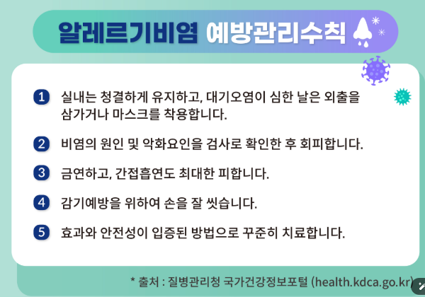 [4] 네이버 블로그 - 알레르기 비염이 의심된다면 예방해보자! - 네이버 블로그 (https://m.blog.naver.com/mohw2016/221913105099)