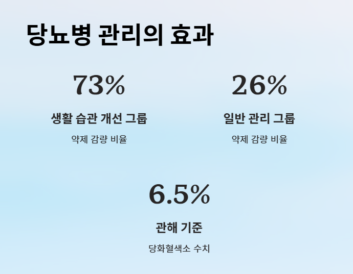 연구에 따르면, 생활 습관 개선 프로그램을 적극적으로 실천한 당뇨병 환자 그룹의 **약제 감량 비율은 73%**에 달한 반면, 일반적인 관리만 받은 그룹은 26%에 불과했습니다. 즉, 당뇨병을 조기에 관리하면 약물 사용을 줄이거나 중단할 수도 있다는 의미입니다.