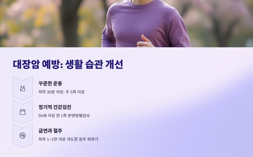 ✅ 식습관과 운동 습관을 개선하여 대장암 위험을 낮추세요.