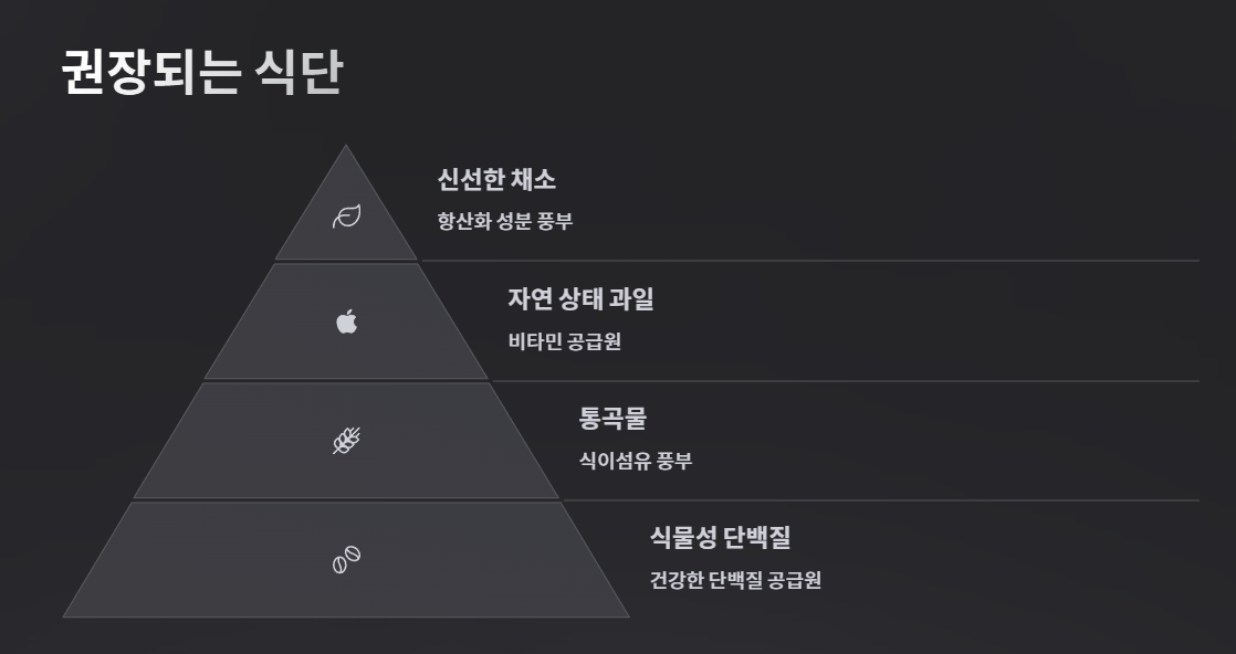 신선한 채소와 과일, 통곡물, 식물성 단백질을 중심으로 한 식단이 권장됩니다. 가공식품과 고지방, 고당분 식품은 피하는 것이 좋습니다.