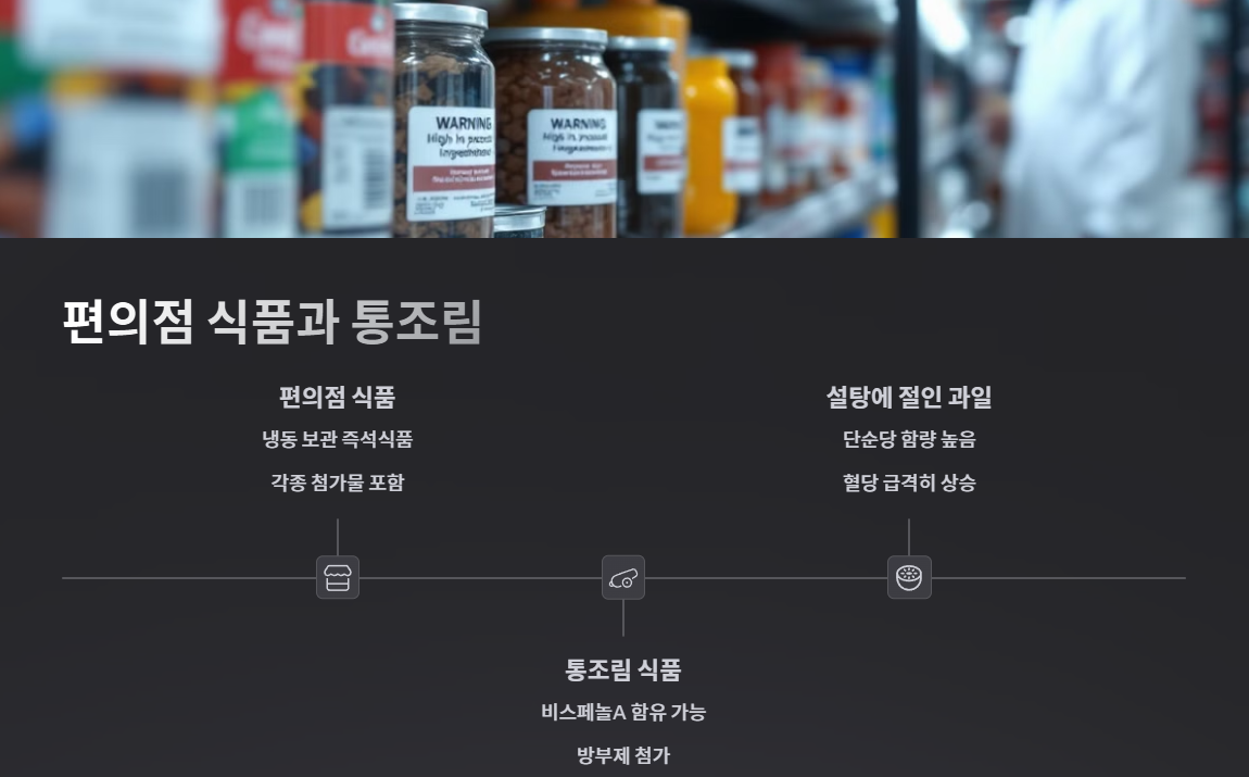 편의점에서 판매되는 즉석식품은 조리 후 냉동 보관되며, 각종 첨가물이 포함되어 있습니다. 이러한 식품은 혈당을 빠르게 올리고, 방부제와 화학 첨가물이 다량 포함되어 있어 건강에 좋지 않습니다.