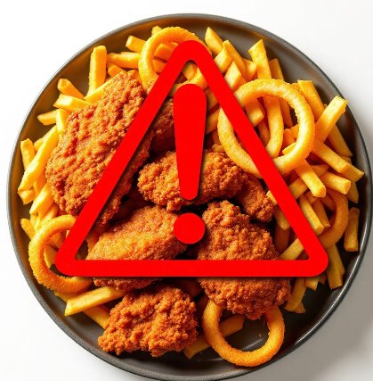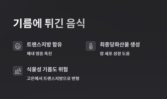 튀김류는 트랜스지방과 최종당화산물(AGEs)을 다량 함유하고 있습니다. 이러한 물질들은 체내 염증을 촉진하고 암 세포의 성장을 도울 수 있습니다. 특히, 식물성 기름이라 해도 고온에서 가열하면 트랜스지방으로 변형될 수 있습니다. 따라서 튀긴 음식은 가능한 한 피하는 것이 좋습니다.