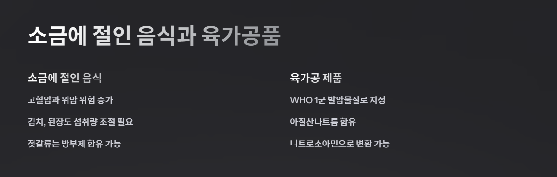 햄, 소시지, 베이컨 등 육가공 제품은 세계보건기구(WHO)에서 1군 발암물질로 지정하였습니다. 이러한 제품에는 아질산나트륨이 첨가되어 있으며, 이는 체내에서 발암물질인 니트로소아민으로 변환될 수 있습니다. 따라서 육가공 제품의 섭취를 제한하는 것이 바람직합니다.